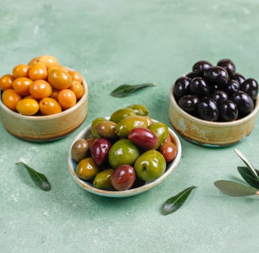 Manzanilla, hojiblanca, verdes o negras, gordal, alcaparras, etc.